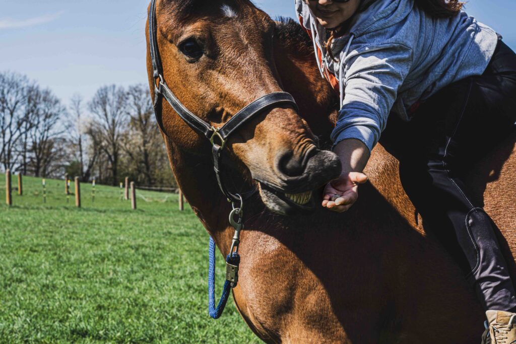 Nach ein paar Tagen kannst du dein Pferd auch langsam an den Hänger heranführen. Der erste Schritt ist geschafft, wenn das Pferd bereit ist, mit den Vorderhufen auf den Rampenaufgang zu treten. Lobe dein Pferd für seine Kooperation – entweder mit Worten, Streicheleinheiten oder kleinen Leckerlis, wie zum Beispiel den veganen nacani CBD-Snacks, die nicht nur beruhigend wirken, sondern auch das Training effektiver machen können.